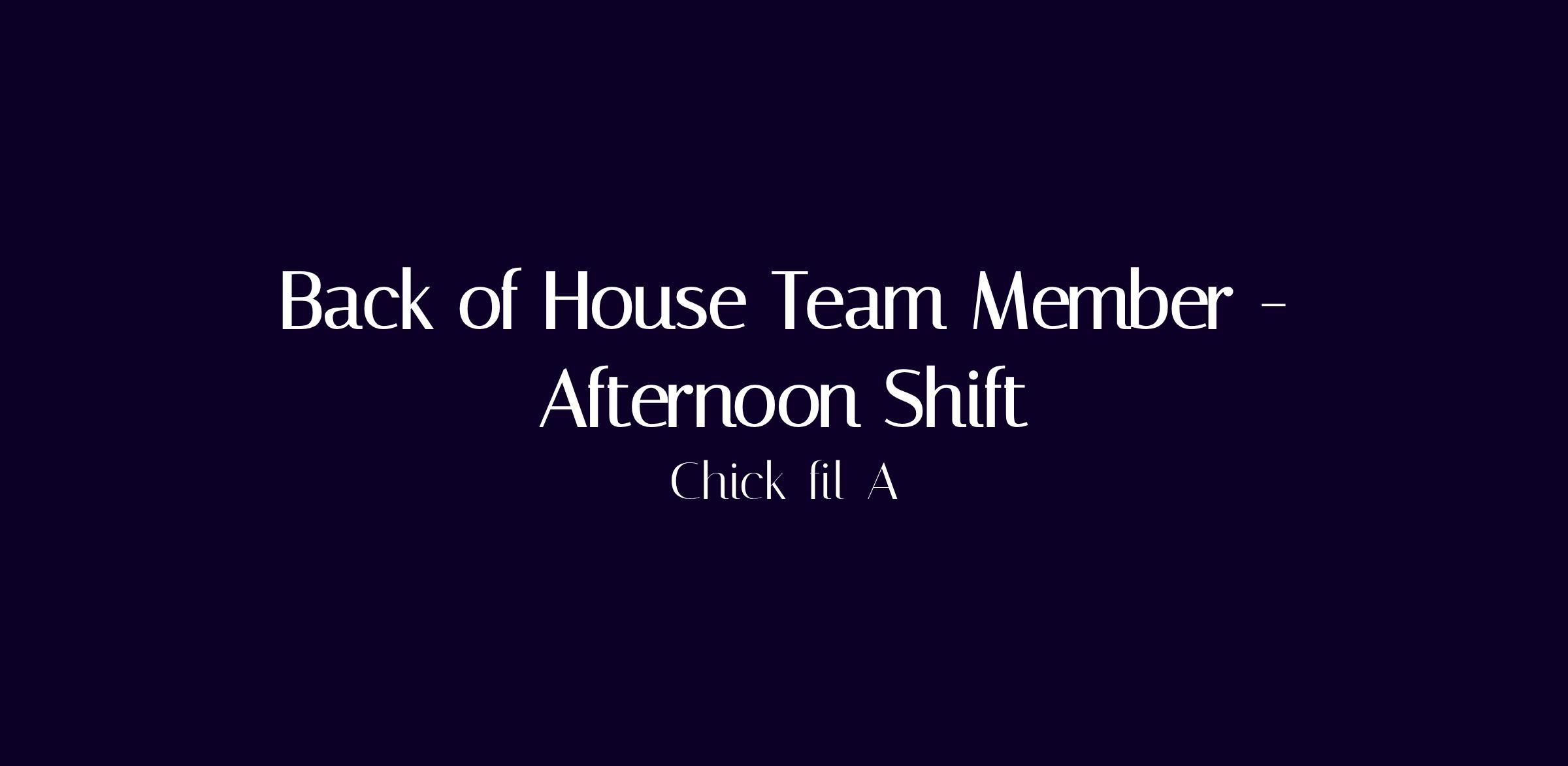 At Chick-fil-A, the Team Member role is more than just a job, it's an opportunity. In addition to working directly for an independent Operator, team members gain life experience that goes far beyond just serving a great product in a friendly environment. Chick-fil-A is a great opportunity for people of all ages and backgrounds, and no experience is necessary. As a BOH Team Member, you will support the kitchen team, assemble food & drink orders quickly and accurately, and ensure each guest leaves with a smile. We are looking for friendly, enthusiastic people who enjoy serving customers. We will teach you everything else you need to know!